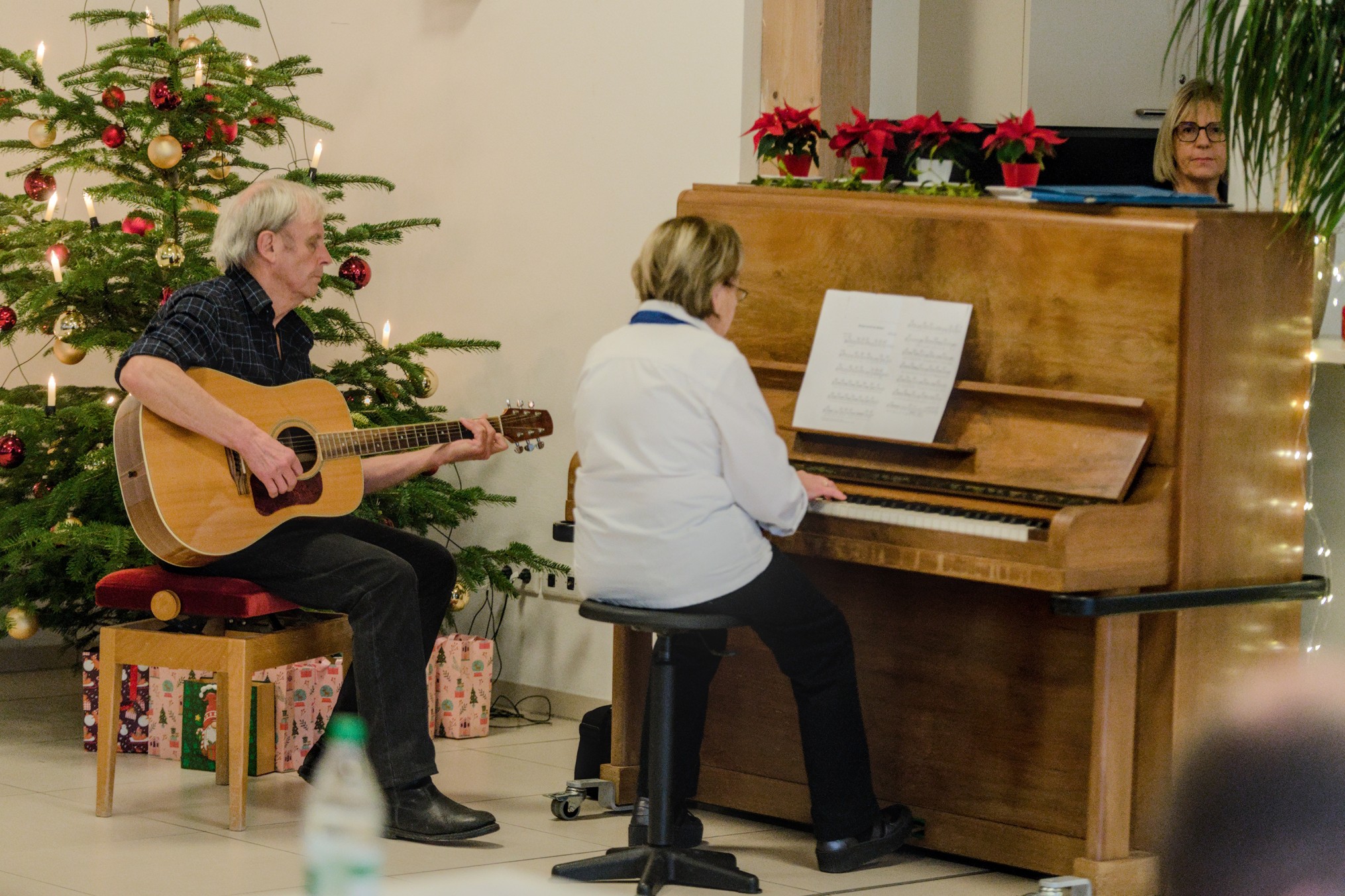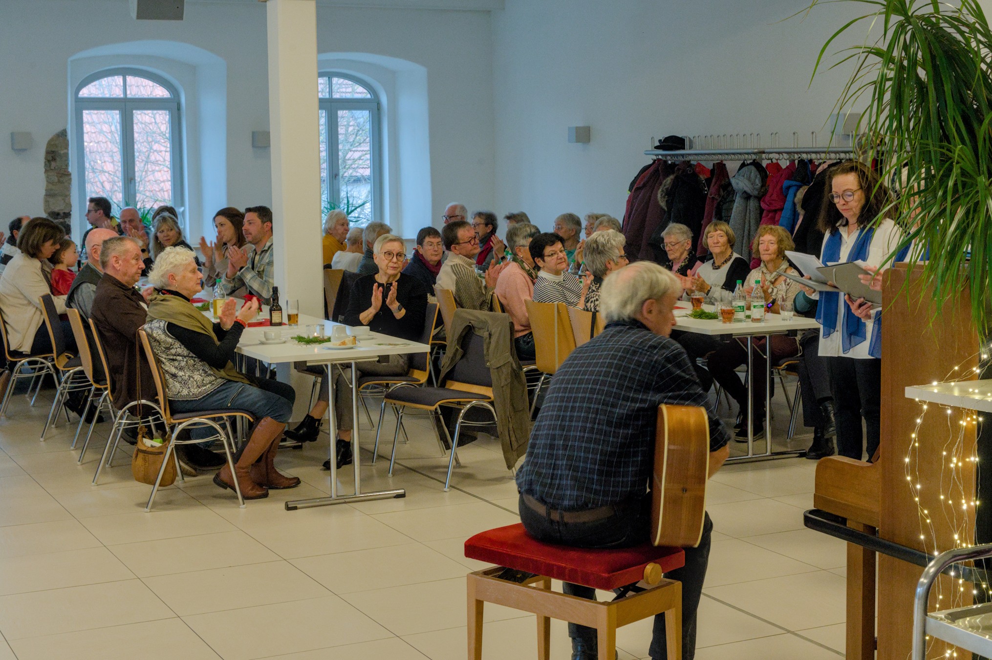 Die Ortsgruppe Geislingen des Schwäbischen Albvereins lud am 2. Adventssonntag zur traditionellen Adventsfeier ein. Viele Mitglieder und Freunde folgten der Einladung und so füllte sich der Bürgersaal in der Harmonie rasch. Nach dem Beginn mit Kaffee und Kuchen begrüßte der Vorsitzende Paul Burkowski die Gäste und drückte seine Freude aus, dass so viele gekommen sind. Musikalisch wurde die Feier durch die vereinseigene Singgruppe unter der Leitung von Anna Pitzer und mit Begleitung durch Willy Schreiber an der Gitarre umrahmt. Sie brachten ein paar schöne Lieder zum Vortrag. Als besondere Begleitung konnten sie noch Thomas Wahl gewinnen, der einige Liedvorträge mit der Trommel bereicherte.